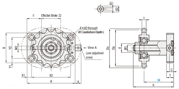 | Part Number | Number of Teeth | H 1 mm Increments | h (Max.) | M1 (Coarse) | M2 (Coarse) | Lever Travel per Rotation (mm) | d | A | B | T | X1 | X2 | Y1 | Y2 | a | d1 | d2 | L | C | B1 | B2 | E | |