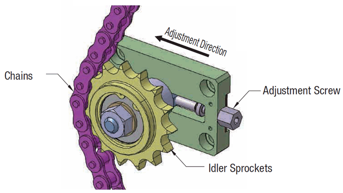 ![]() | ■Tension Adjustment Method (1) Loosen the nut (2) Adjust the tension using the adjustment screw (3) Loosen the nut ■Adjustment Method of Stainless Steel Type ·Both the idler shaft and adjustment screw are made of stainless steel, so when adjusting scuffing may occur. ·You are advise to apply grease to the adjustment screw before making adjustments. |